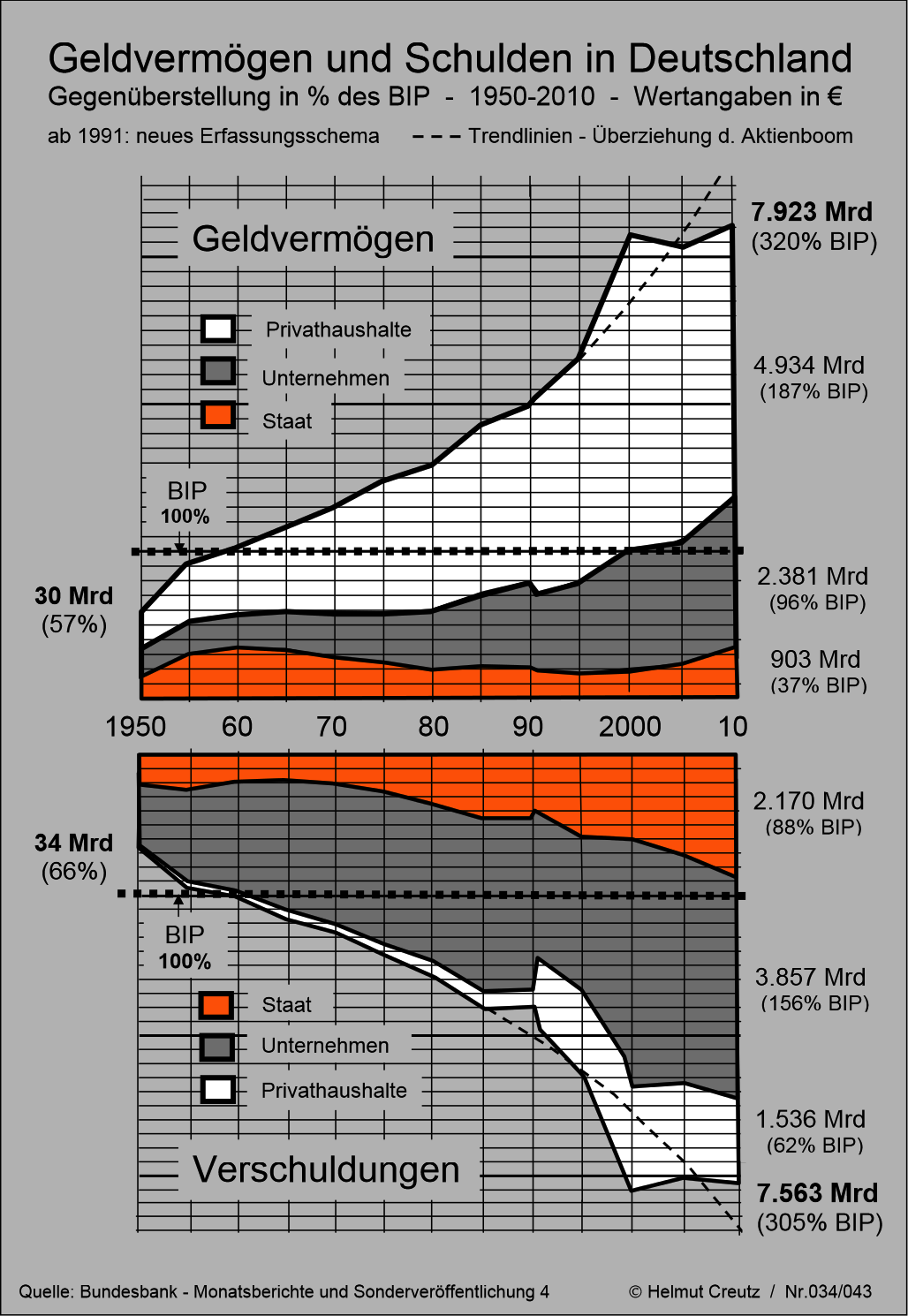 Erläuterungen zur Darstellung Nr. 034/043: In der Darstellung werden, bezogen auf den Zeitraum 1950 bis 2010 und den deutschen Wirtschaftsraum, den Entwicklungen der Geldvermögen im oberen Teil der Grafik die der Verschuldungen im unteren Teil gegenüber gestellt.