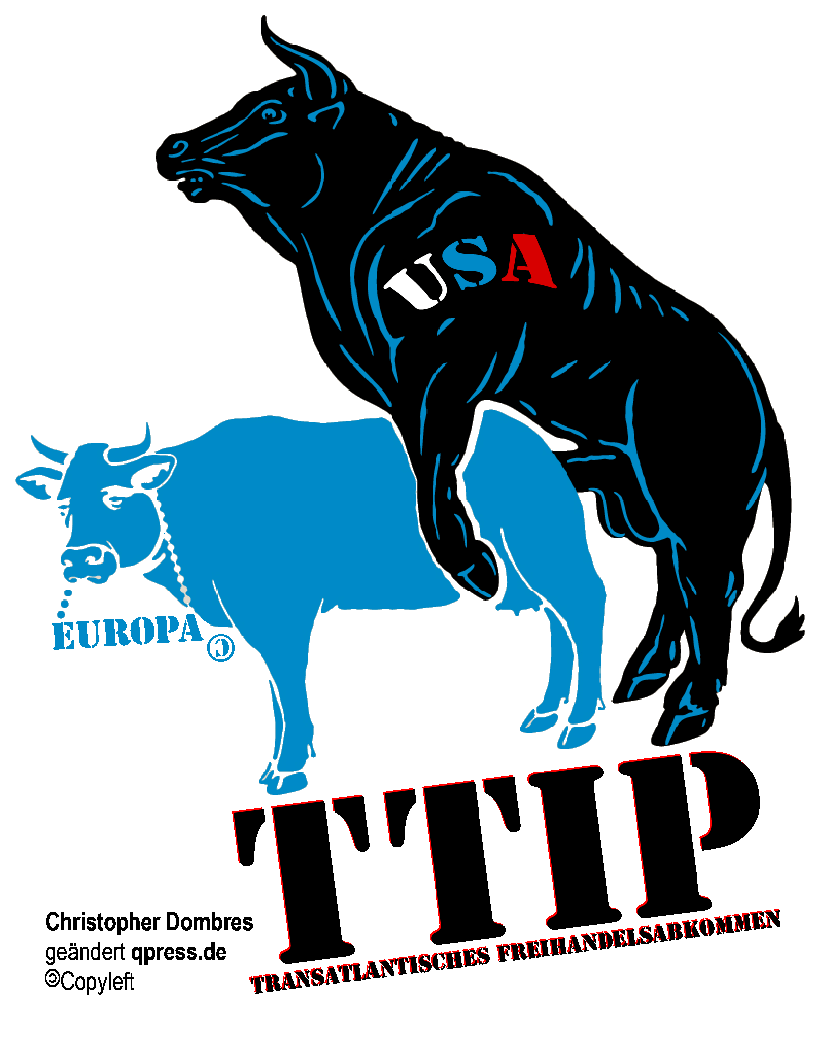 4. USA fucks Europe! Das Transatlantische Freihandelsabkommen, offiziell Transatlantische Handels- und Investitionspartnerschaft (englisch Transatlantic Trade and Investment Partnership, TTIP, früher Trans-Atlantic Free Trade Agreement, TAFTA), ist ein unter Ausschluß der Öffentlichkeit verhandeltes Freihandels- und Investitionsschutzabkommen in Form eines völkerrechtlichen Vertrags zwischen der Europäischen Union und den USA. Die genauen Vertragsbedingungen werden seit Juli 2013 ausgehandelt, dieser Prozess ist nicht nur intransparent, sondern beschleunigt den Entdemogratisierungsprozess. Ur-Grafik: Christopher Dombres. Quelle: Flickr.(Link zum Bild nicht mehr verfügbar!) Verbreitung mit CC-Lizenz Namensnennung 2.0 Generic (CC BY 2.0). Grafikbearbeitung: Wilfried Kahrs / QPress.de .