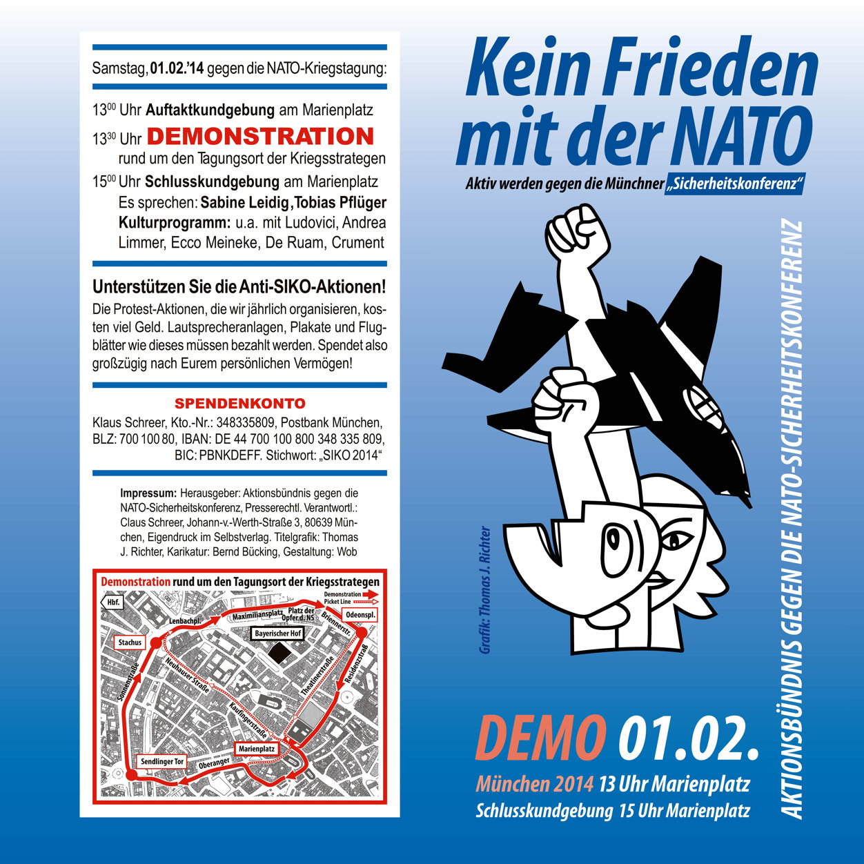 Es ist längst an der Zeit, dagegen etwas grundlegend anderes ins Feld zu führen: Eine Kultur des Friedens, zivile Denkmuster, Kultur gegen Krieg. Dazu soll unser Protest gegen die 50. Sicherheitskonferenz (kurz: SiKo) Anlass geben, reichlich Phantasie zu entwickeln. Wir wollen in dem Bewusstsein demonstrieren, dass zwei Drittel der Bevölkerung gegen militärische "Lösungen" stehen, auch wenn die Regierenden bislang darüber frech hinweg gehen.