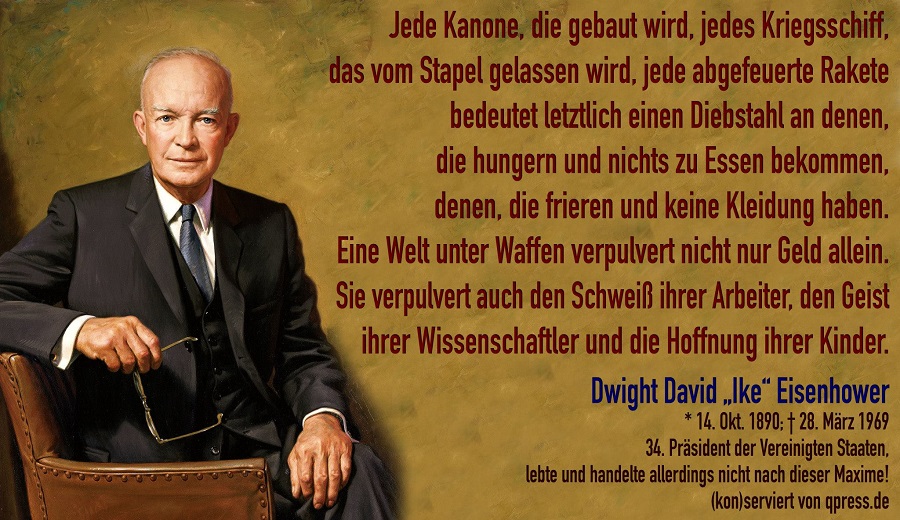 Als Präsident warnte Eisenhower eindringlich vor den Gefahren, die ein einflussreicher militärisch-industrieller Komplex für die USA in Zukunft mit sich bringen würde. So sagte er in seiner Rede „Chance for Peace“ am 16. April 1953: „Jede Kanone, die gebaut wird, jedes Kriegsschiff, das vom Stapel gelassen wird, jede abgefeuerte Rakete ... “. Eine eindringliche Warnung vor dem militärisch-industriellen Komplex sprach er während seiner Abschiedsrede vom 17. Januar 1961 aus. Grafikbearbeitung: Wilfried Kahrs / QPress