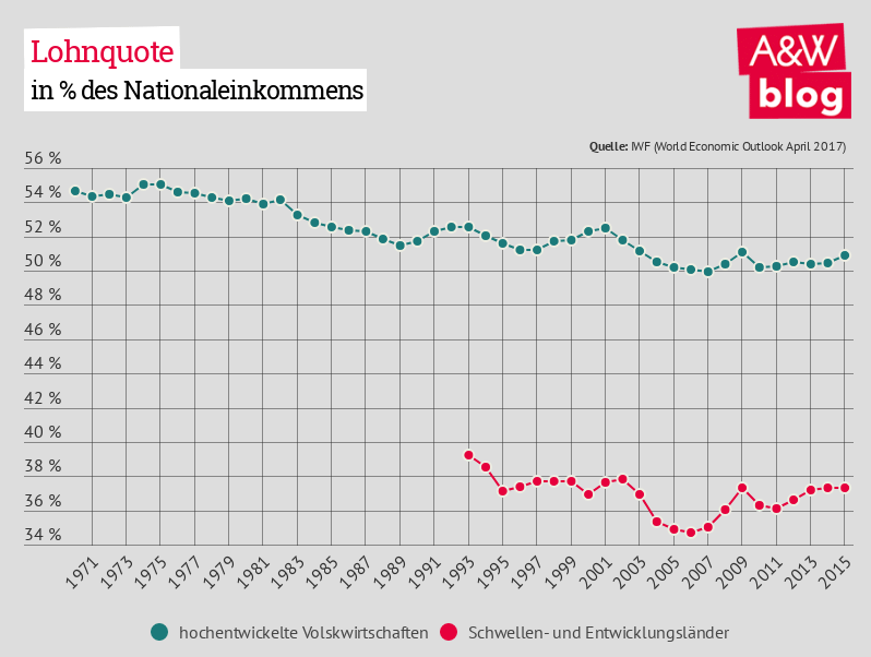 2. Grafik-1: Lohnquote in % des Nationaleinkommens. Quelle: IWF / A&W blog.