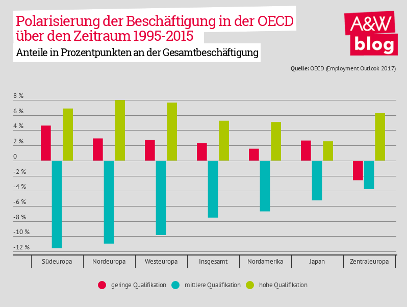In den letzten Jahrzehnten gab es in der OECD praktisch kein Beschäftigungswachstum mehr im Segment mittlerer Qualifikationen. Im Gegenteil, die Jobs für Büroangestellte oder FacharbeiterInnen wurden immer knapper. Stattdessen nahmen die Jobs vor allem im hoch qualifizierten Segment und zum Teil auch im Niedrigqualifikationsbereich zu, zumeist aber in Form von prekärer Beschäftigung mit schlechten Arbeitsbedingungen und niedriger Bezahlung.