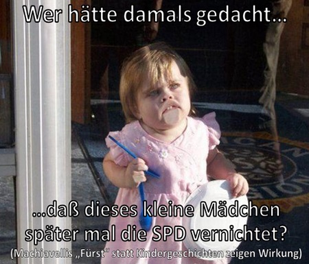 Dabei könnte die letzte Bundestagwahl genau der Pyrrhussieg sein, mit dem sich Angela Merkel zu Tode siegte. Ihre Eigenschaft, Koalitionspartner zu verschließen, hätte sie das Amt gekostet, mit dem sie ohnehin nichts anzufangen weiß. Und weil das noch nicht reicht, hätte sich Machiavelli-Taktikerin Merkel zusätzlich bei den Koalitionsgesprächen verzockt, weil sie es zuließ, daß ihre Unions-Beta-Männchen und Arbeitgeber-Lobbyisten die einzige Kopulationspartnerin unter Druck setzen, die überhaupt zur Verfügung steht – die SPD. Aber Merkel braucht sich keine Sorgen zu machen. Auf der SPD sitzen ebenso karriereorientierte wie ambitionslose und kurzsichtige Reiter, die ihr eigenes Pferd ins Schlachthaus reiten. Aber es ginge auch anders:
