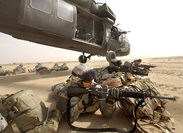 1. US-Soldaten und ein UH-60 Black Hawk Helicopter in der AL JAZEERA DESERT, Irak 2006. Foto: Staff Sgt. Aaron Allmon. Quelle: Wikimedia Commons. Dieses Bild wurde von einem Mitglied der United States Army während der Ausführung seiner Dienstpflichten erstellt. Als eine Arbeit der Bundesregierung der Vereinigten Staaten ist dieses Bild in public domain.
