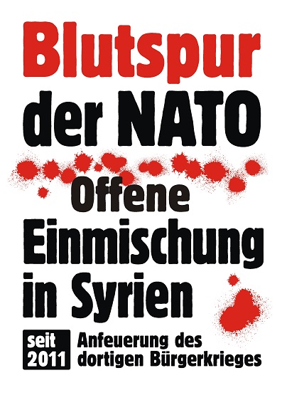 2. Texttafel: "Blutspur der NATO" - Offene Einmischung in Syrien. Seit 2011 Anfeuerung des dortigen Bürgerkrieges. Grafik: Wolfgang Blaschka (WOB), München.