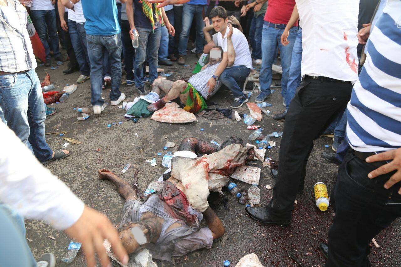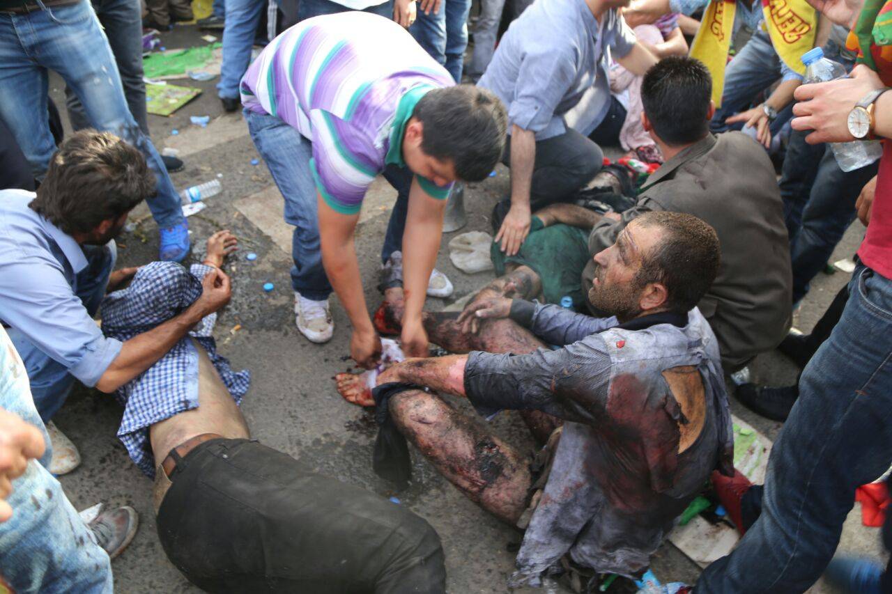Kurz bevor der Co-Vorsitzende der HDP sprechen soll, gibt es plötzlich eine Detonation rechts vor der Bühne. Wir stehen etwas weiter hinten und können nicht richtig einschätzen was passiert. Menschen in der Nähe der Explosion sind offensichtlich in Aufregung. Nach ca. zwei Minuten gibt es eine zweite, stärkere Detonation, deren Druckwelle bis einige hundert Meter weit weg zu spüren ist. Eine Rauchwolke steigt über der Menschenmenge auf. Es wird hektischer und Leute tragen Verletzte zum Ausgang des Veranstaltungsgeländes. Die Verletzten haben verbrannte, zerrissene Kleider und blutige Wunden. Die strömen zunehmend zum Ausgang, es ist unklar, was genau passiert ist. Immer wieder transportieren normale Autos Verletzte davon, vereinzelt kommen Krankenwägen. Als wir das Gelände verlassen, ist die Polizei mit Wasserwerfern vorgefahren, was die Menge zusätzlich aufbringt. Es kommt zu Straßenschlachten.