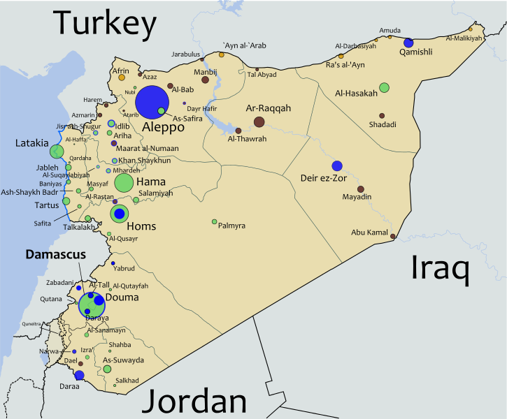 4. Syrian civil war map, showing control by city. Size of circle is proportional to population. Autor: Syria_location_map2.svg: User:NordNordWest Quelle: Wikimedia Commons. Diese Datei ist unter der Creative Commons-Lizenz Namensnennung-Weitergabe unter gleichen Bedingungen 3.0 Unported lizenziert.