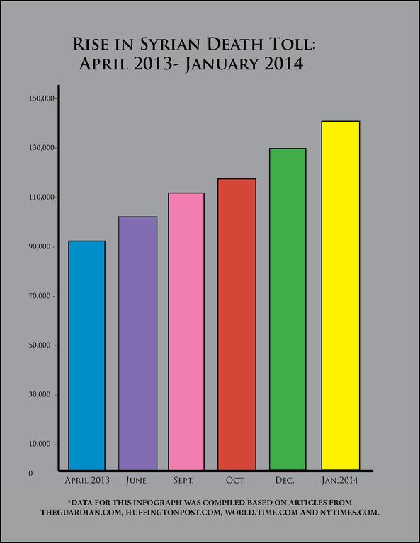 ► Grafik: Deutlicher Anstieg der Anzahl des Totesopfer in Syrien im Zeitraum APRIL 2013 - JAN. 2014. Die Zahlenerhebung erfolgte aus der Auswertung von Artikeln welche in TheGuadian.com, Huffingtonpost.com, World.Time.com und NYTimes.com veröffentlicht wurden. Urheber: Decurry. Quelle: Wikimedia Commons. Diese Datei ist unter der Creative Commons-Lizenz Namensnennung-Weitergabe unter gleichen Bedingungen 3.0 Unported lizenziert.