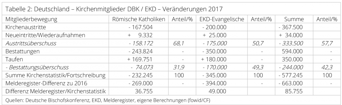 Bei den römischen Katholiken sind es 167.504 Kirchenaustritte, ein Bestattungsüberschuss von 74.073 Mitgliedern (243.824 Bestattungen vs. 169.751 Taufen) und 9.332 Eintritte/Wiederaufnahmen, als Summe 232.245. Die Differenz des Saldo der kirchlich erfassten Mitgliederbewegungen (232.245 Personen) und der Verringerung aufgrund der Angaben der Melderegister (269.000) lässt sich auf rund 37.000 Personen beziffern.