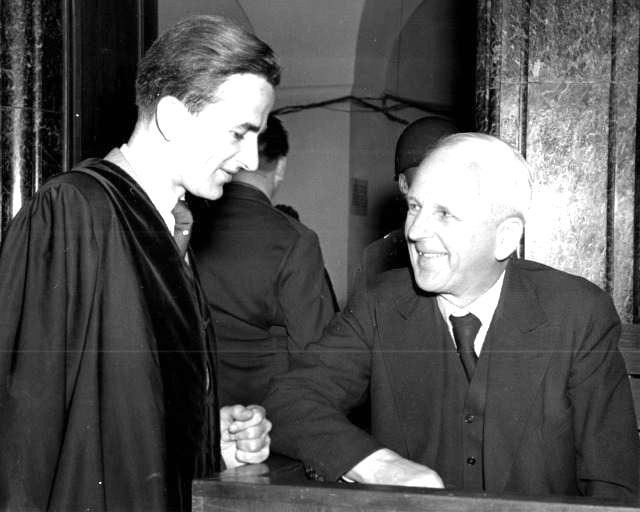 2. Richard von Weizsäcker (links) zusammen mit seinem Vater Ernst Heinrich Freiherr von Weizsäcker (rechts) in Nürnberg zur Zeit des Wilhelmstraßen-Prozesses. Neben seinem Studium arbeitete Weizsäcker von 1947 bis Anfang 1949 als Assistent von Rechtsanwalt Hellmut Becker, der der Verteidiger seines Vaters bei den Nürnberger Kriegsverbrecherprozessen war. Während der Nürnberger Kriegsverbrecherprozesse war Weizsäcker im sogenannten ‚Wilhelmstraßen-Prozess‘ Hilfsverteidiger seines Vaters, des SS-Brigadeführers und Staatssekretärs Ernst von Weizsäcker, der aufgrund seiner aktiven Mitwirkung bei der Deportation französischer Juden nach Auschwitz wegen Verbrechen gegen die Menschlichkeit zu einer sieben-, später fünfjährigen Haftstrafe verurteilt wurde. Richard von Weizsäcker bezeichnete das Urteil später immer als „historisch und moralisch ungerecht“