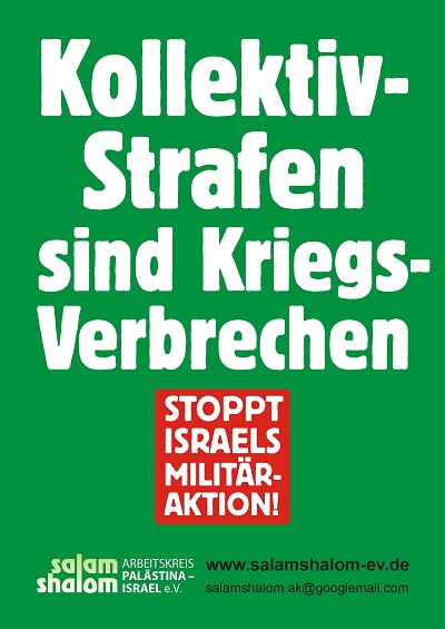 3. Plakat: "Kollektivstrafen sind Kriegsverbrechen - Stoppt Israels Militäraktion!" Grafik: Wolfgang Blaschka (WOB)