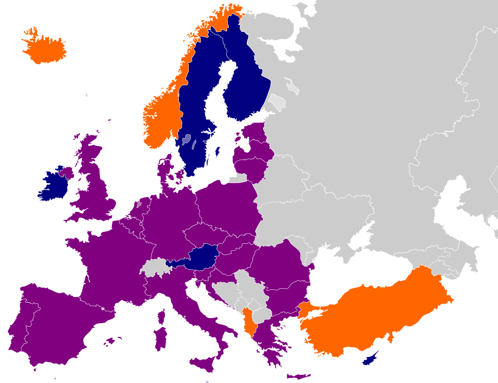 3. Europakarte, welche Mitgliedschaften in EU und NATO zeigt. Urheber: Joebloggsy. Quelle: Wikimedia Commons. Der Urheberrechtsinhaber veröffentlichte dieses Werkes als gemeinfrei. Dies gilt weltweit.