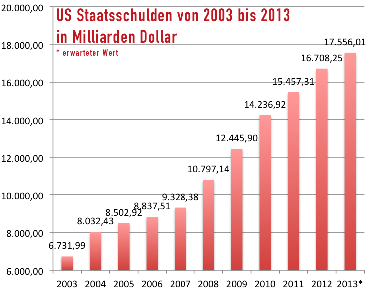 Wir nehmen den nächsten kritischen Schuldenstand an, der mit 16,7 Billionen Dollar noch im Oktober 2013 erwartet wird und machen eine kleine Rekordrundschau zum Thema Dollar und amerikanische Präsidenten. Genau genommen hat er 42 Präsidenten (mit Ausnahme von George Bush), schon im Sack, sprich alle von diesen verursachten Schulden in Summe bereits überrundet. Und den George W. wird er mit Sicherheit bis zum (geplanten) Ende seiner Amtszeit auch noch locker mit in den Sack stecken. Zum tatsächlichen Schuldenstand gibt es übrigens unterschiedliche Auffassungen, dazu kommen wir aber im Verlauf der Geschichte noch.
