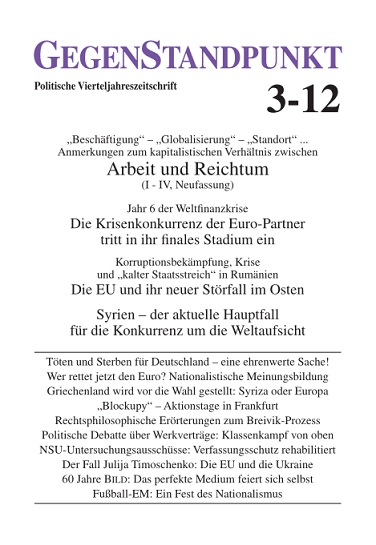 In der Tat sind es die Gegensätze, die in der staatlich eingerichteten und bewachten friedlichen Marktwirtschaft immer wieder "Unfrieden" stiften. Die sind mal materiell begründet: Jede Eigentumsübertretung durch Privatpersonen, die kein Eigentum als Geldquelle einsetzen können und deswegen vom hierzulande produzierten Reichtum ausgeschlossen sind, ist ein Bruch des Grundprinzips der herrschenden Wirtschaftsordnung und muss mit Gewalt im Keim erstickt werden; mal sind es die psychologischen Konsequenzen der Konkurrenzgesellschaft, die innerhalb des Privatlebens der Bürger zu Gewalttätigkeiten aller Art führen und auch für "Jugendgewalt" verantwortlich sind. Mal ist es der organisierte Widerstand gegen "undeutsche Elemente", mit dem enttäuschte braune Nationalisten wie der NSU sich mordend bemerkbar machen; und mal ist es der Widerstand gegen das ganze System, zu dem zuletzt die RAF angetreten ist. All dies hat dem Staat eines deutlich gemacht: Trotz des mit allen demokratischen Mitteln wie Gesetzeszwang und erlaubter konstruktiver Kritik hergestellten freiwilligen Gehorsams der Mehrheit des Staatsvolks muss er auf seine Bürger acht geben. Denn Gründe für Protest, Widerstand und unerlaubte Gegenwehr schaffen die Regierungen in jeder Legislaturperiode genug. Und das wissen sie auch. Deswegen ist jede Verschärfung des Waffenrechts nichts als eine weitere Absicherung seines Gewaltmonopols und damit der politischen und ökonomischen Zwecke, für die es eingerichtet ist.