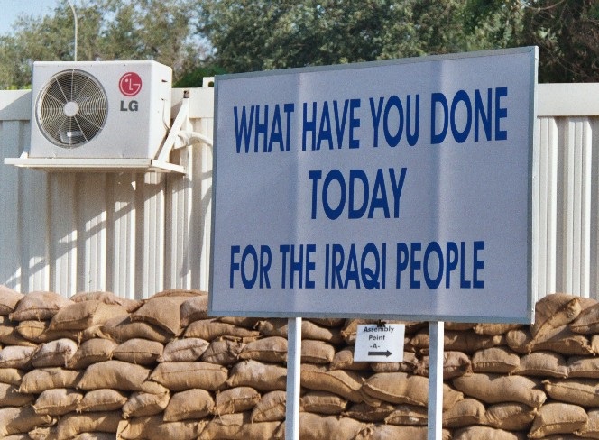 Unter Saddam hatten die Iraker eine gut gehende Wirtschaft mit einer reichen Mittelklasse, eine gut funktionierende Infrastruktur auf dem Niveau der höchstentwickelten Länder der Welt, freie medizinische Versorgung und freie Bildung bis zum Hochschulabschluss. Heute haben die Iraker eine Arbeitslosenrate von 50%, ein Problem, Wasser und elektrischen Strom zu bekommen und zusammengebombte Krankenhäuser und Schulen.