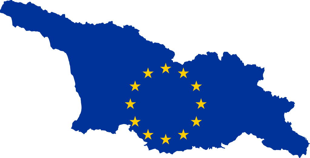 2. Karte Georgiens mit der Flagge der EU. Georgien mit kaum mehr Einwohnern als Berlin, aber mit noch größeren Problemen behaftet, will Frau Merkel nun den Weg in die Europäische Union ebnen. Quelle: Wikimedia Commons. Der Urheberrechtsinhaber veröffentlichte dieses Werk als gemeinfrei. Dies gilt weltweit.
