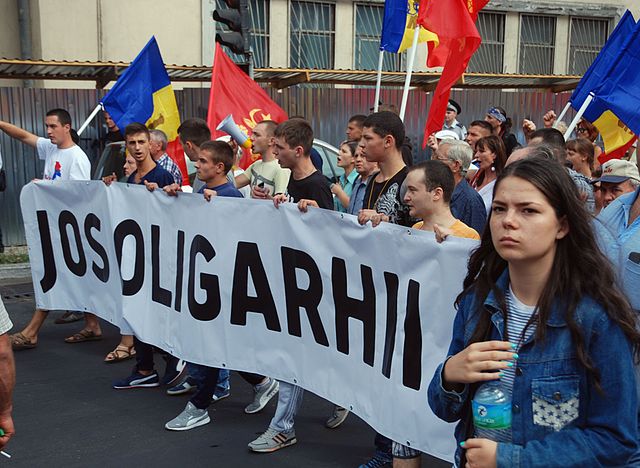 1. „Weg mit den Oligarchen“: einer der Slogans bei den Protesten am 6. September 2015 in Chisinau, Hauptstadt der Republik Moldau. Foto: Bertramz. Quelle: Wikimedia Commons. Diese Datei ist unter der Creative-Commons-Lizenz „Namensnennung – Weitergabe unter gleichen Bedingungen 3.0 nicht portiert“ lizenziert.