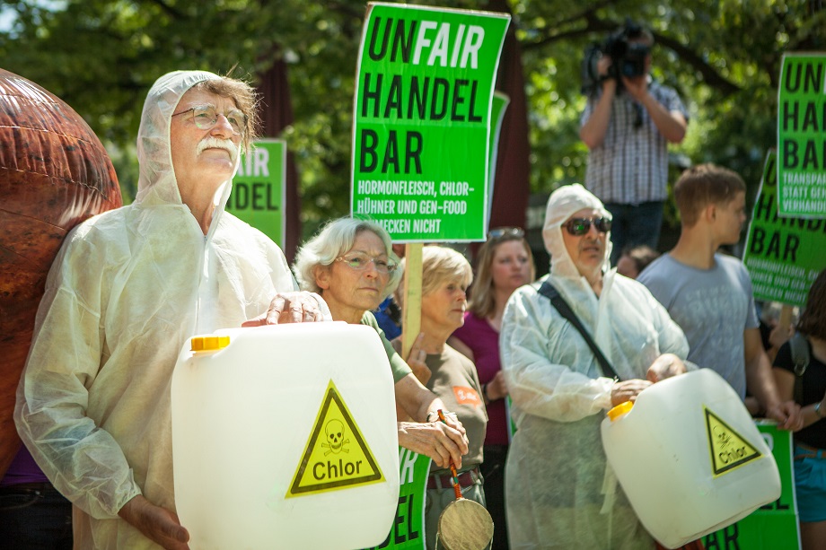 4. TTIP bringt uns Chlorhühnchen, Hormonfleisch und gentechnischveränderte Lebensmittel. Deshalb NEIN zu TTIP. NEIN zu Lobbyismus. Foto: Jakob Huber/Campact. Quelle: Flickr. Verbreitung mit CC-Lizenz Namensnennung-Nicht kommerziell 2.0 Generic (CC BY-NC 2.0)
