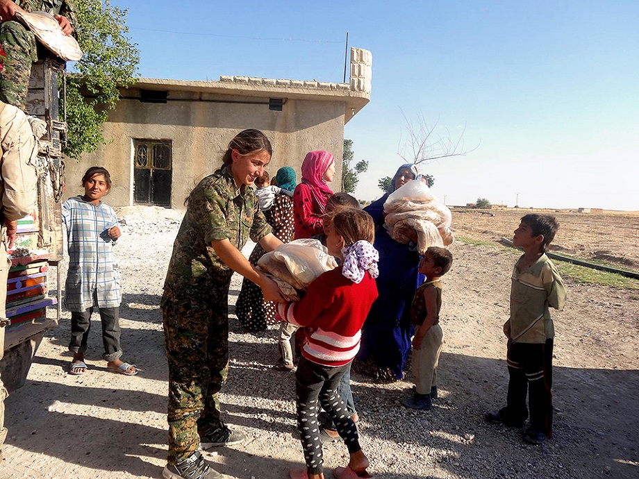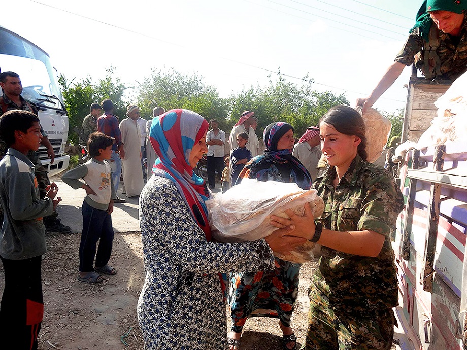 8 + 9. GIRE SPI, Rojava (June 19, 2015) - The visit led by the Women’s Defense Units (YPJ) consisted of delivering essential supplies for the population of several villages in Gire Spi (Tal Abyad) rural district, including water, wheat, bread, rice and fruits. The locals were cut off water and other critical requirements under Daesh (ISIS) terrorists’ occupation on their region. YPJ members were informed by the locals that Daesh terrorists had blown up water tanks in some of the visited villages while losing the battle for Gire Spi on June 15, leaving the residents, particularly the children, with a risk of dehydration in boiling heat.