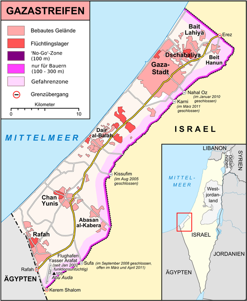 2. Karte des Gazastreifens nach UN-Angabe im Dezember 2012 / Januar 2013. Autor: Maki1. Quelle: Wikimedia Commons. Diese Datei ist unter der Creative-Commons-Lizenz „Namensnennung – Weitergabe unter gleichen Bedingungen 3.0 nicht portiert“ lizenziert.