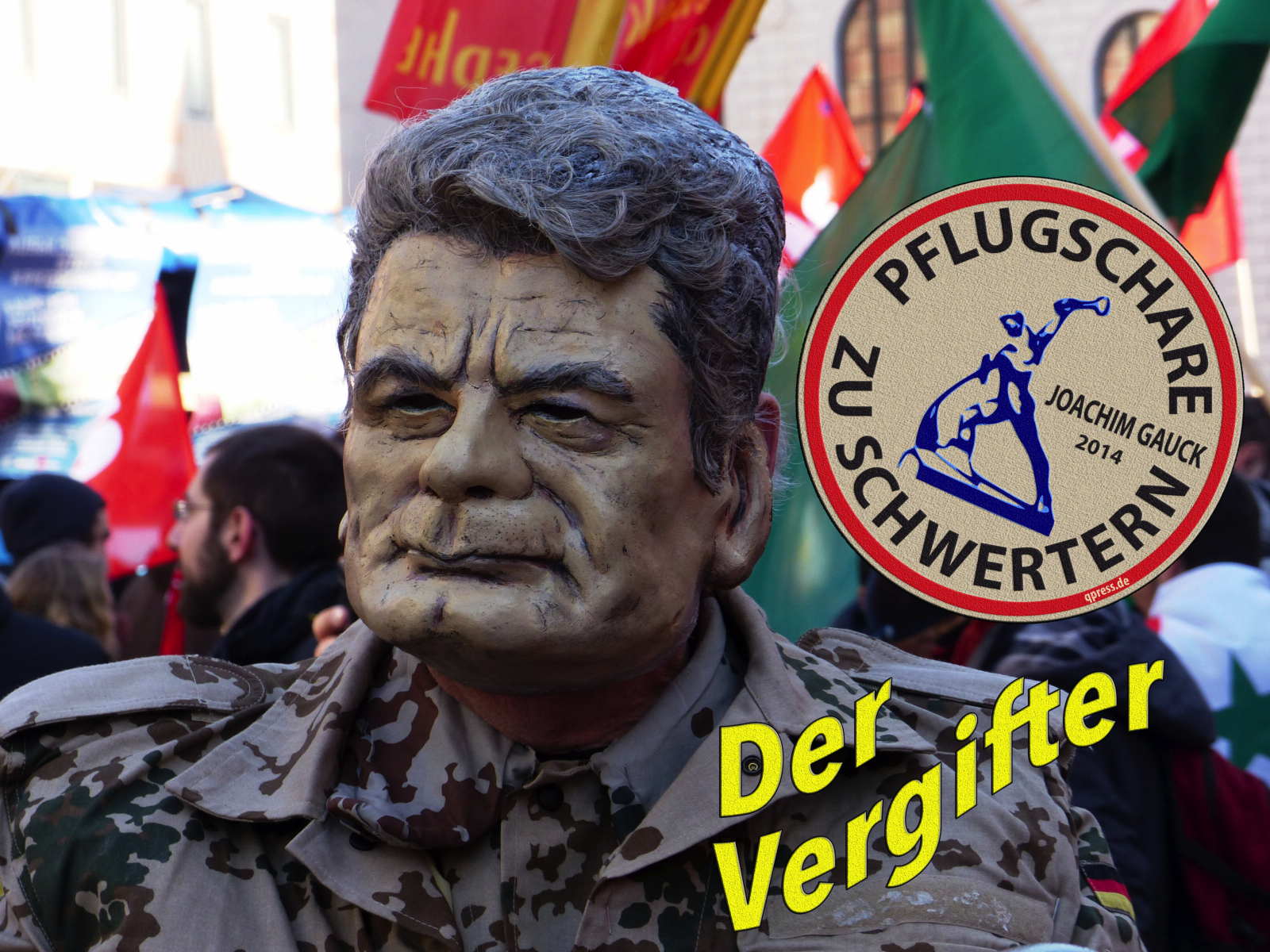 1. Joachim Gauck 2014 bei der SiKo München. "Schwerter zu Pflugscharen" ist ein zur Redewendung gewordenes Teilzitat aus der Bibel, das das Ziel des Völkerfriedens durch weltweite Abrüstung und Rüstungskonversion ausdrückt. Ab 1980 wurde das Zitat zum Symbol staatsunabhängiger Abrüstungsinitiativen in der DDR, das auch Teile der westdeutschen Friedensbewegung übernahmen."Flugschare zu Schwertern" ist die wortgedrehte Version und eher zu einigen Gauck Äußerungen hinsichtlich militärischer Präsenz deutscher Soldaten und Rüstungsgüter passend. Aktionskünstler Günter Wangerin protestiert als Bundespräsident Gauck verkleidet. Grafikbearbeitung: Wilfried Kahrs / QPress.