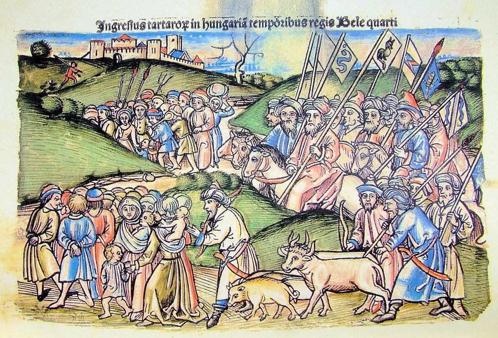 3. Mongolensturm. Nach der Schlacht bei Muhi schleppen Mongolen versklavte Ungarn fort. In der Darstellung von 1488 sind die Mongolen als Muslime dargestellt; den Islam nahmen sie allerdings erst später an. Bildillustration: Johannes de Thurocz (1435 – 1488 oder 1489, ungarischer Historiker und Illustrator. Quelle: Wikimedia Commons. Diese Bild- oder Mediendatei ist gemeinfrei, weil ihre urheberrechtliche Schutzfrist abgelaufen ist. Dies gilt für die Europäische Union, Australien und alle weiteren Staaten mit einer gesetzlichen Schutzfrist von 70 Jahren nach dem Tod des Urhebers.
