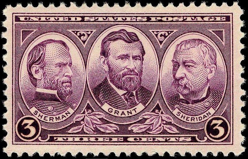 2. Die Generäle Sherman, Grant und Sheridan auf einer Briefmarke von 1965. Autor: U.S. Post Office, 1937; Bureau of Engraving and Printing. Quellen: U.S. Government; Post Office Department / Wikimedia Commons. Der Urheberrechtsinhaber dieses Werkes veröffentliche es als gemeinfrei. Dies gilt weltweit.