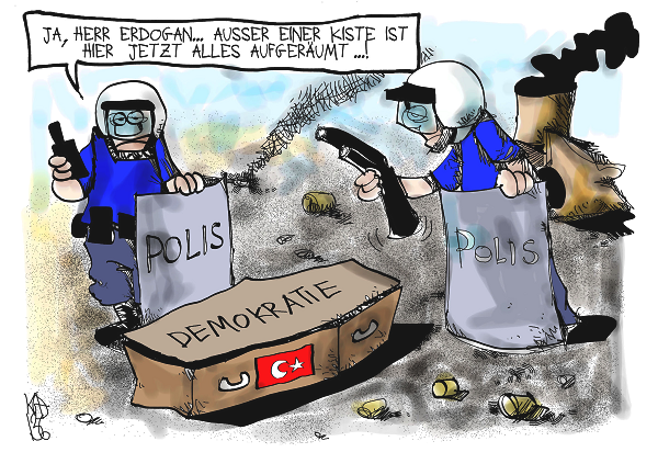 Die Empörung deutscher Politiker ist pure Heuchelei. Bis vor kurzem galt die Türkei noch als „Demokratiemodell“, das in Ländern wir Ägypten oder Libyen kopiert werden sollte. Auf den „Terrorlisten“ der EU befinden sich bis heute eine Reihe linker türkischer Organisationen sowie die kurdische PKK. Linke AktivistInnen werden bis heute in der BRD u.a. westlichen Ländern verfolgt, vor Gericht gestellt oder abgeschoben. Solidarität mit den Kämpfenden in der Türkei muss auch Solidarität mit diesen GenossInnen hier bedeuten: