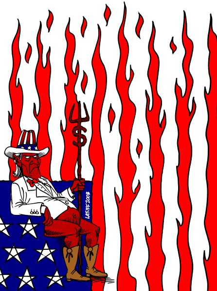 9. Karikatur "The Great Satan" von Carlos Latuff, einem "Politischen Karikaturist", geboren November 1968 in Rio de Janeiro, Brazil. Quelle: Wikimedia Commons. Der Urheberrechtsinhaber erlaubt es jedem, dieses Werk für jeglichen Zweck, inklusive uneingeschränkter Weiterveröffentlichung, kommerziellem Gebrauch und Modifizierung, zu nutzen.