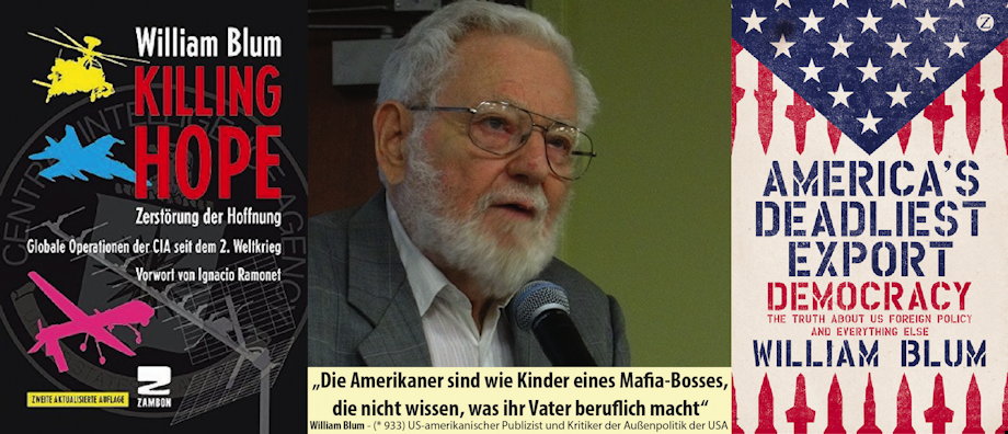 William Blum (* 1933) ist ein US-amerikanischer Schriftsteller und Kritiker der Außenpolitik der USA. Er war früher beim State Department beschäftigt, das er 1967 wegen seiner Opposition zum Vietnamkrieg verließ. Blum wurde einer der Begründer der Untergrundzeitung "Washington Free Press", die in den 1960er und 70er Jahren kritisch über den Vietnamkrieg berichtete. Er hat ausführlich zu Geheimoperationen und Morden der CIA geforscht und publiziert.